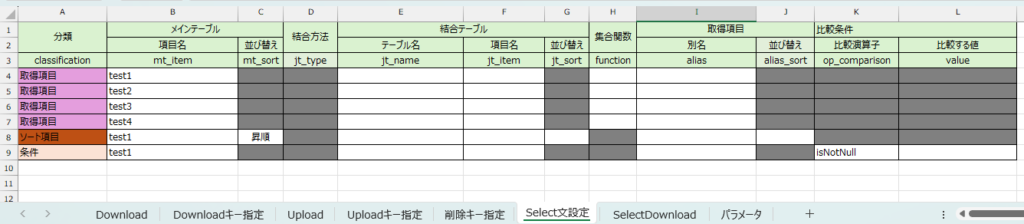 | SELECTダウンロード設定シート | SELECTダウンロード設定用シートのシート名を入力します。 |