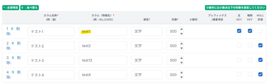 以下の実際のテーブル項目から、アップロード・ダウンロードをしたい条件にあたるキーを、